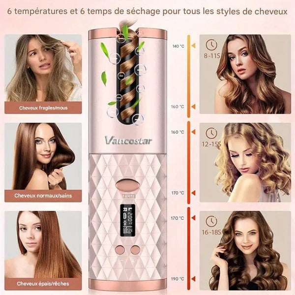 Ce boucleur sans fil se distingue par sa portabilité, sa sécurité anti-brûlures, sa compatibilité universelle et ses résultats professionnels, le tout à un prix abordable.