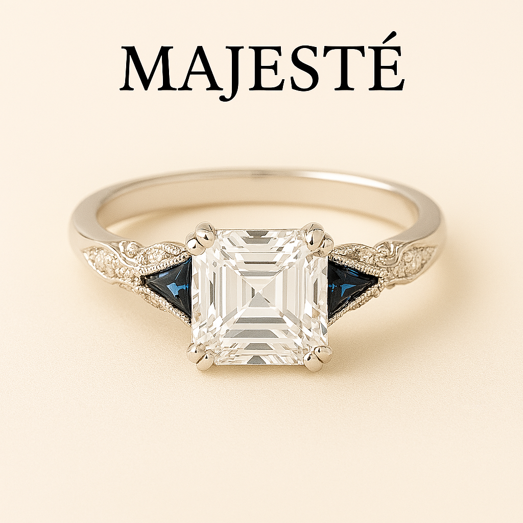 MAJESTÉ est une bague au style vintage, ornée d’un zircon carré au centre, taillée façon Asscher pour un effet miroir saisissant. Deux cristaux bleus triangulaires encadrent la pierre principale, ajoutant contraste et profondeur à son éclat. Le bandeau finement travaillé est décoré de petits zircons transparents et de détails métalliques délicats qui évoquent l’élégance d’une époque révolue. Une pièce noble et accessible, pensée pour les femmes qui aiment porter l’exception sans compromis.