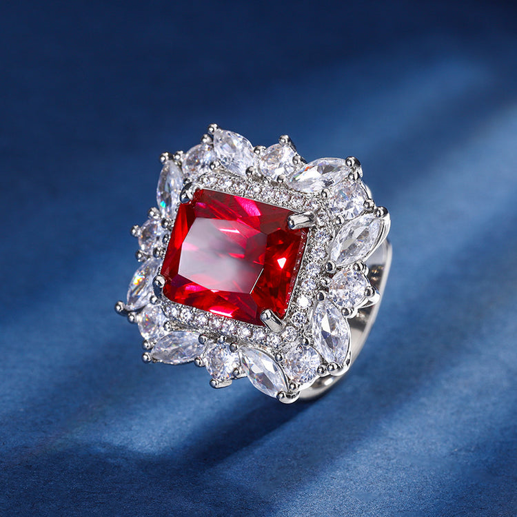Collier : chaîne box délicate, ornée d’un pendentif géométrique en rubis. Bague : design raffiné, mettant en valeur la pierre éclatante. Boucles d’oreilles : Clous d'oreilles élégants, parfaits pour illuminer le visage.